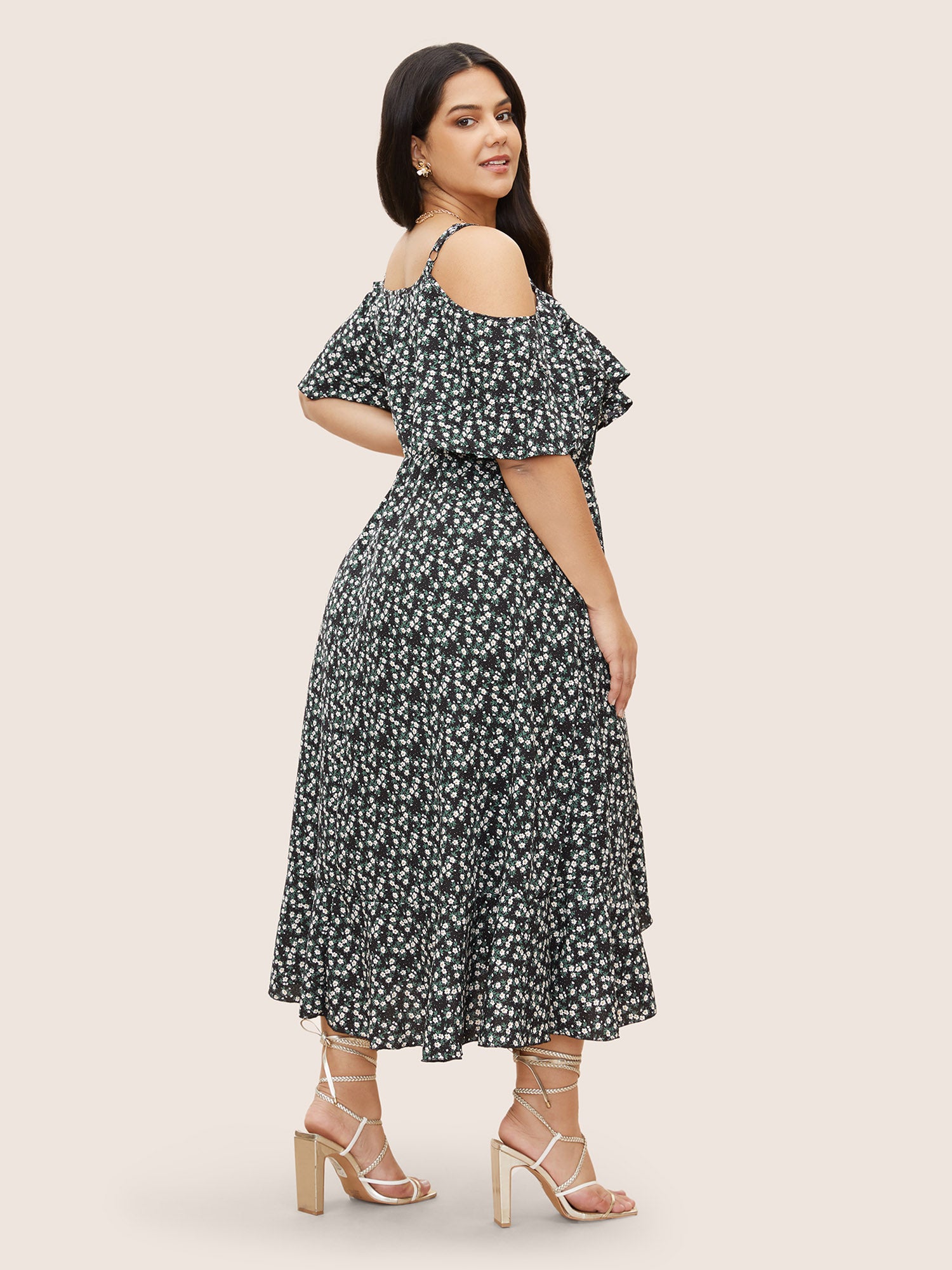 • Ditsy Floral Pocket Wrap Cold Shoulder Ruffle Dress